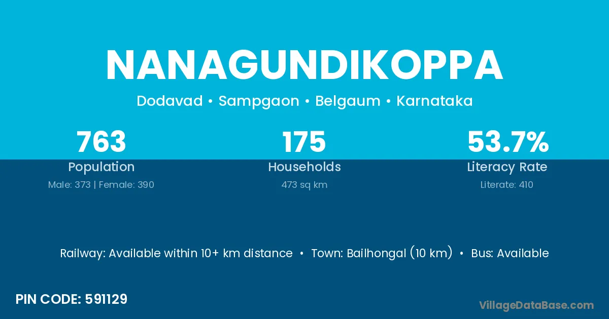 Bailhongal (10 km) is the nearest town to Nanagundikoppa village for major economic activities and is located approximately 10 km away.
