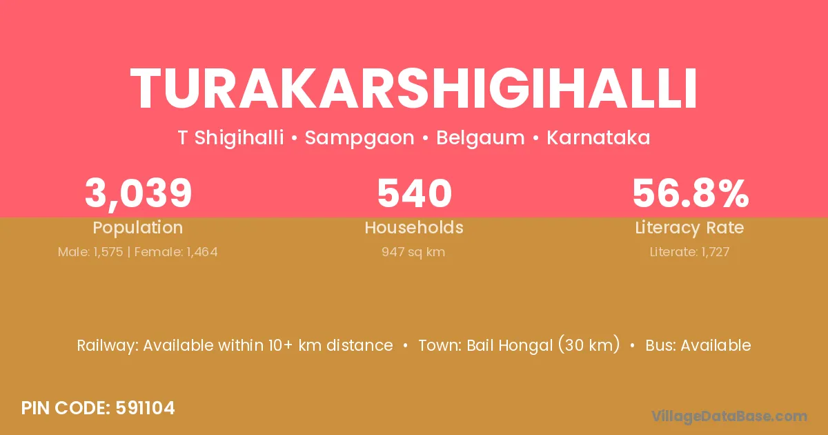 Bail Hongal (30 km) is the nearest town to Turakarshigihalli village for major economic activities and is located approximately 30 km away.