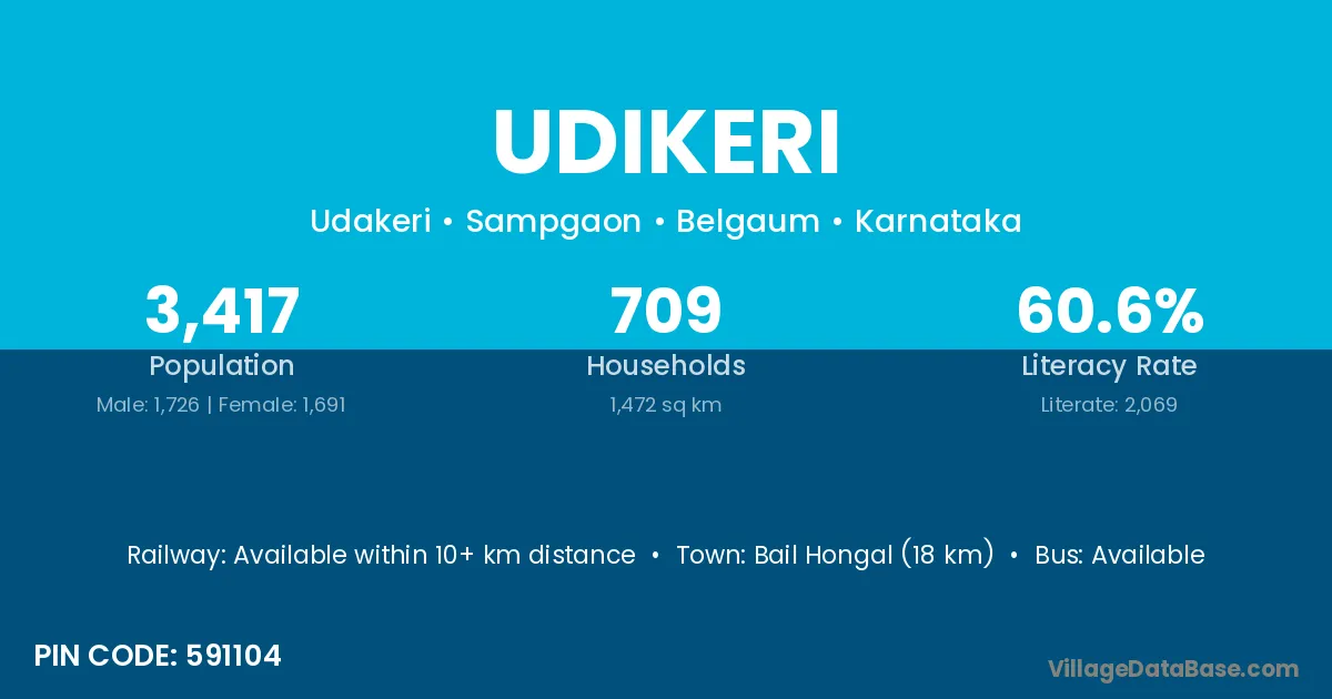 Bail Hongal (18 km) is the nearest town to Udikeri village for major economic activities and is located approximately 18 km away.