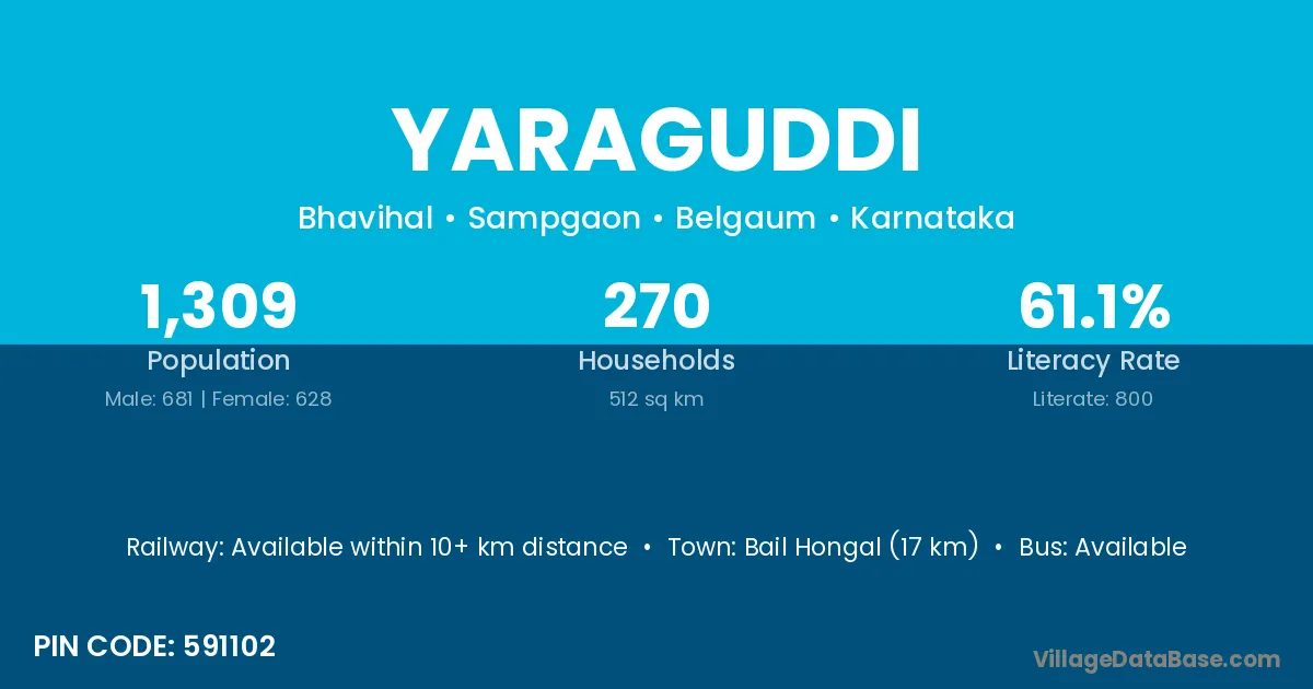 Bail Hongal (17 km) is the nearest town to Yaraguddi village for major economic activities and is located approximately 17 km away.