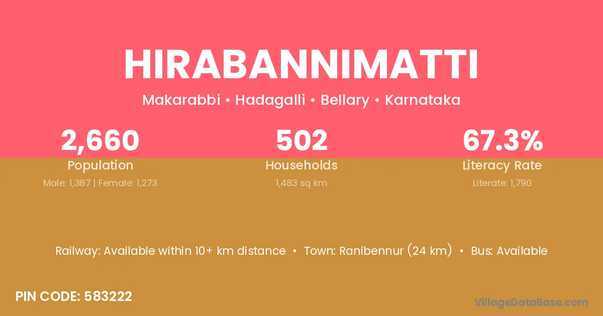 Ranibennur (24 km) is the nearest town to Hirabannimatti village for major economic activities and is located approximately 24 km away.