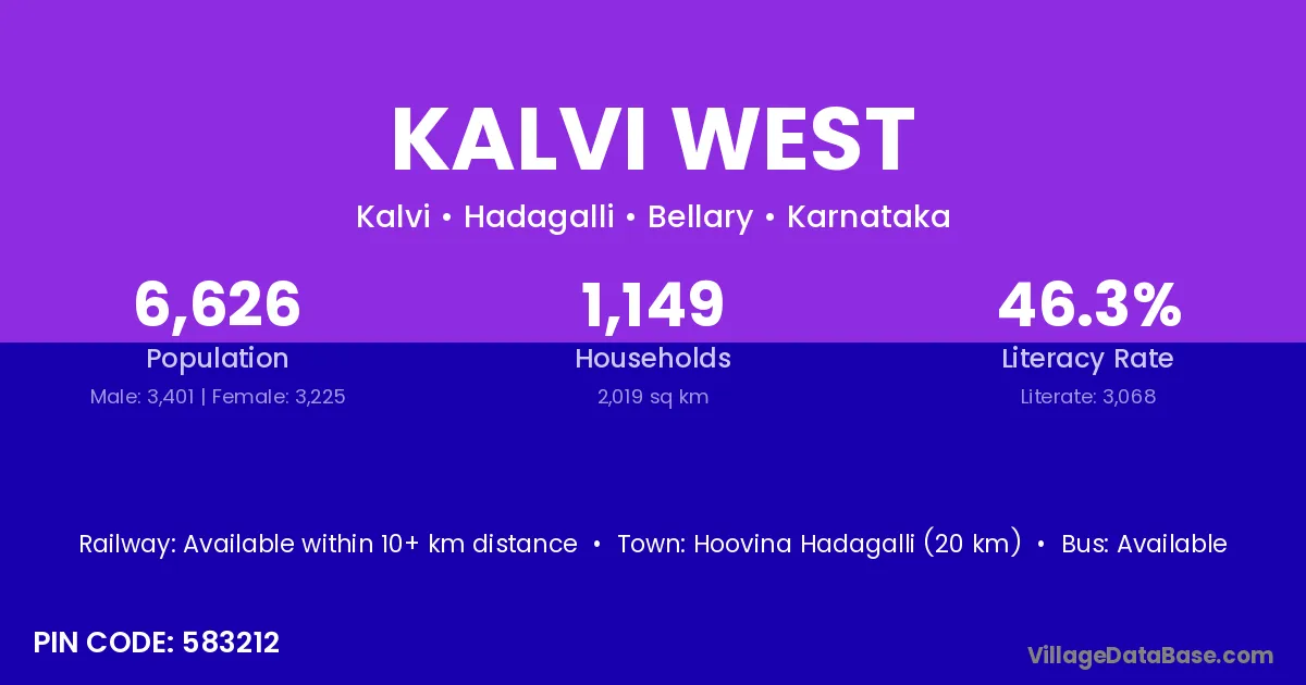 Hoovina Hadagalli (20 km) is the nearest town to Kalvi West village for major economic activities and is located approximately 20 km away.