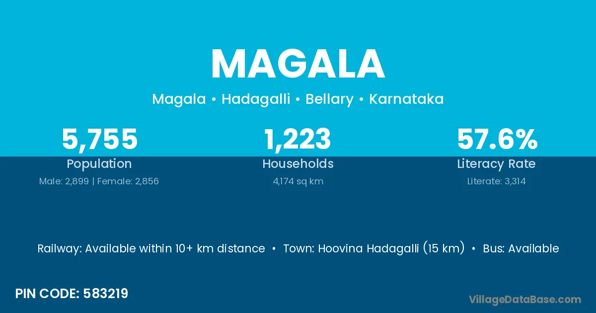 Hoovina Hadagalli (15 km) is the nearest town to Magala village for major economic activities and is located approximately 15 km away.