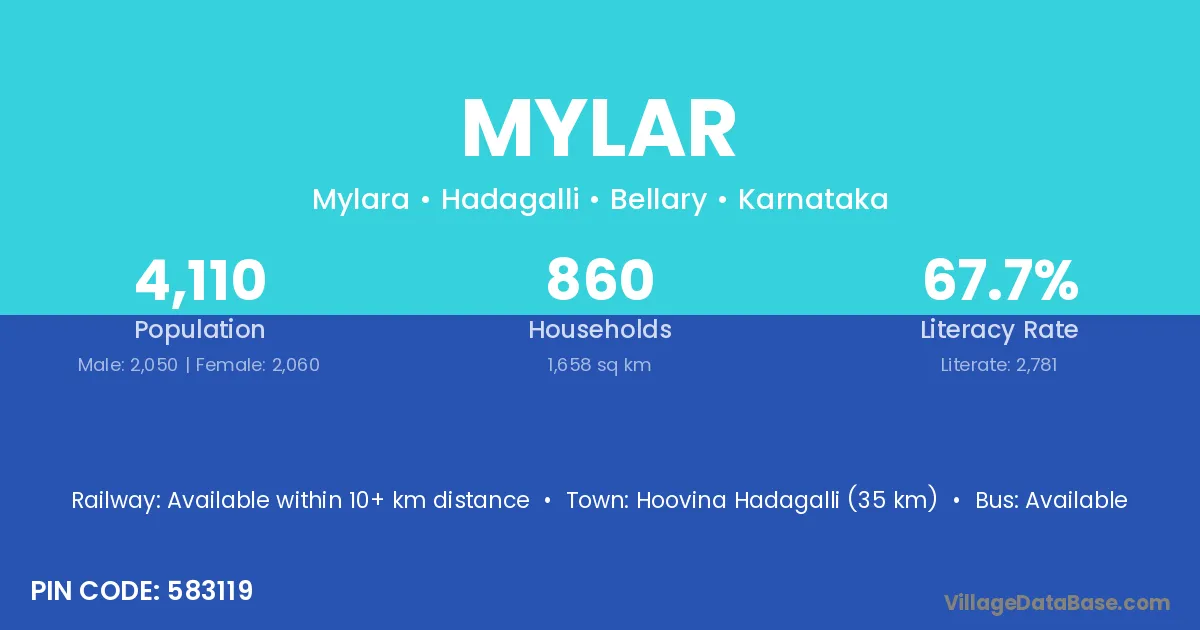 Hoovina Hadagalli (35 km) is the nearest town to Mylar village for major economic activities and is located approximately 35 km away.