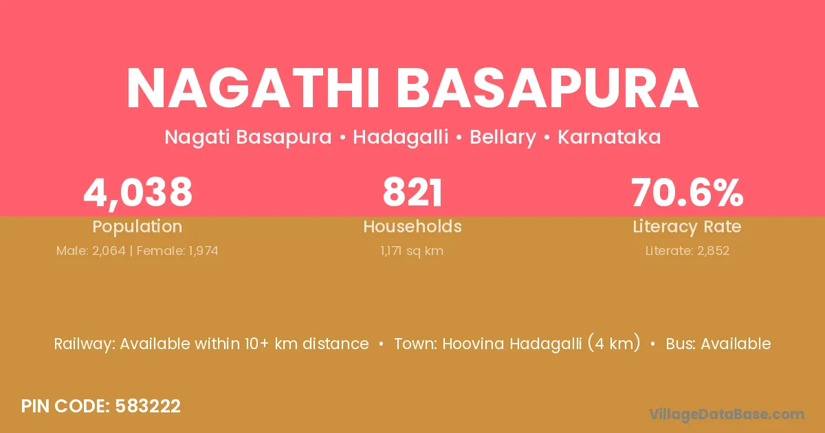 Hoovina Hadagalli (4 km) is the nearest town to Nagathi Basapura village for major economic activities and is located approximately 4 km away.