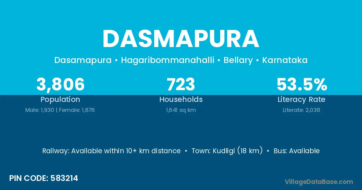Kudligi (18 km) is the nearest town to Dasmapura village for major economic activities and is located approximately 18 km away.