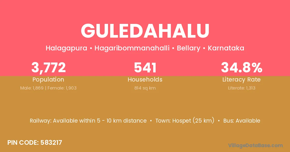 Hospet (25 km) is the nearest town to Guledahalu village for major economic activities and is located approximately 25 km away.