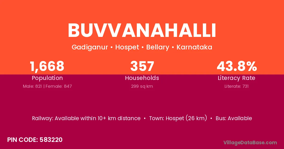 Buvvanahalli village has a total population of 1,668 people, of which 821 are males and 847 are females.