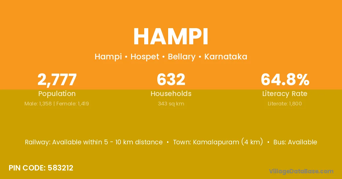 Hampi village has a total population of 2,777 people, of which 1,358 are males and 1,419 are females.