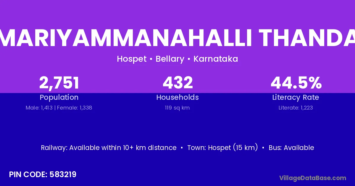 Mariyammanahalli Thanda village has a total population of 2,751 people, of which 1,413 are males and 1,338 are females.