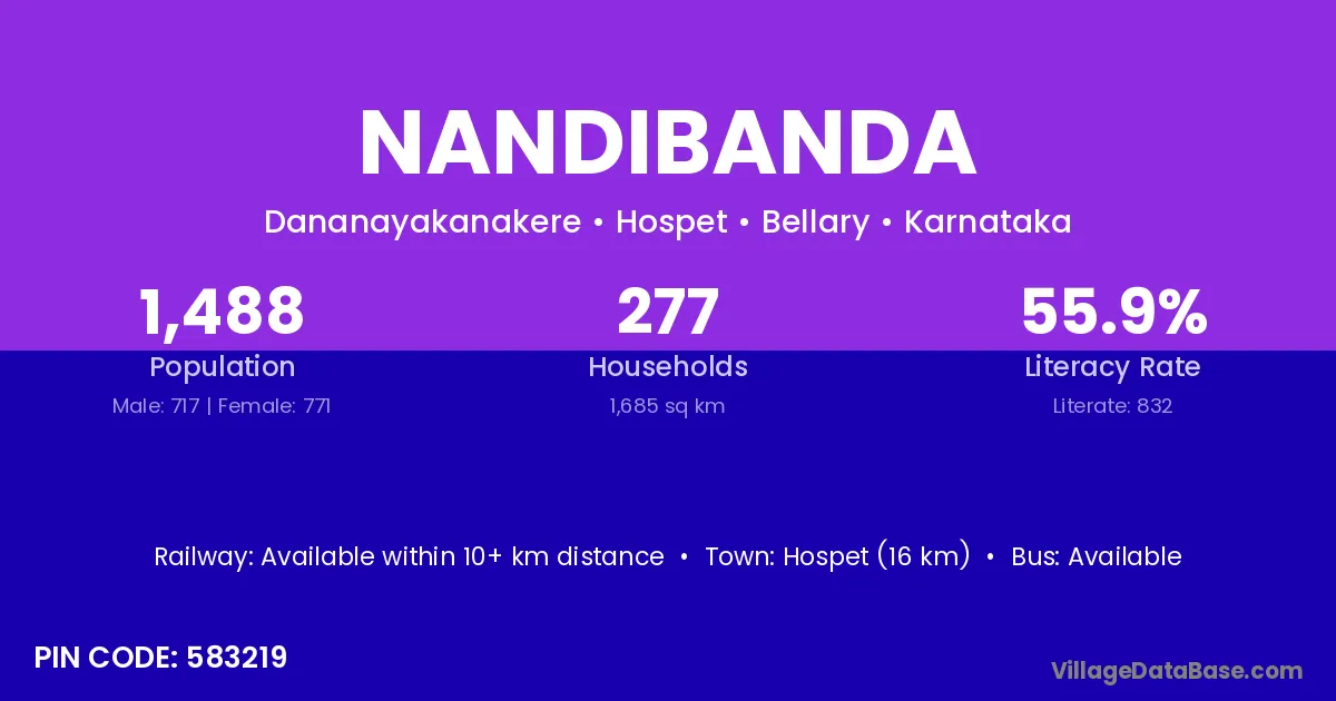 Hospet (16 km) is the nearest town to Nandibanda village for major economic activities and is located approximately 16 km away.