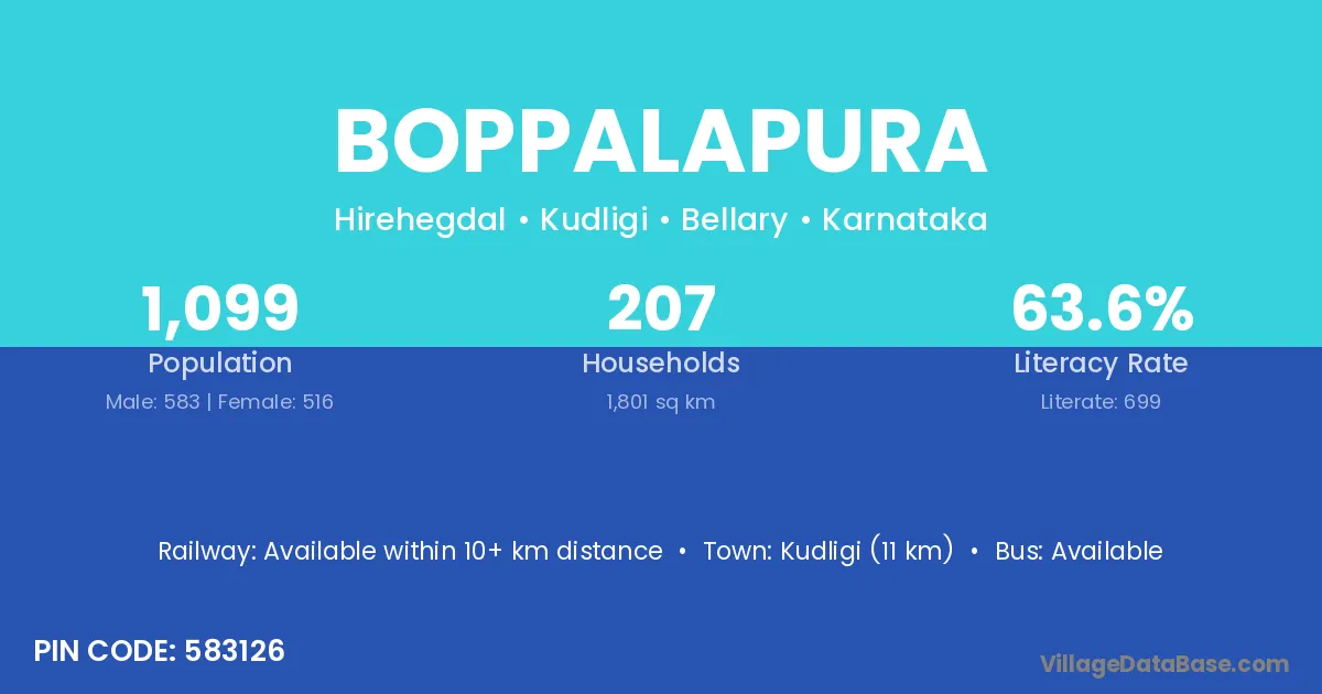 Kudligi (11 km) is the nearest town to Boppalapura village for major economic activities and is located approximately 11 km away.