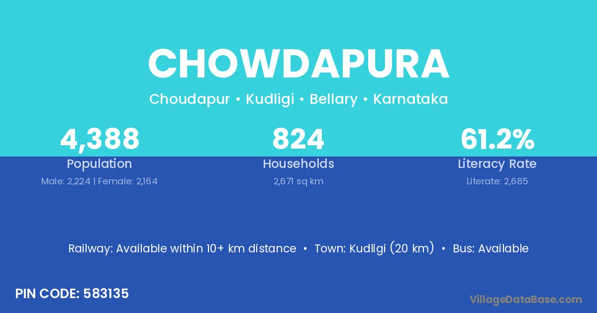 Kudligi (20 km) is the nearest town to Chowdapura village for major economic activities and is located approximately 20 km away.