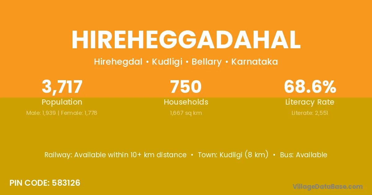 Kudligi (8 km) is the nearest town to Hireheggadahal village for major economic activities and is located approximately 8 km away.