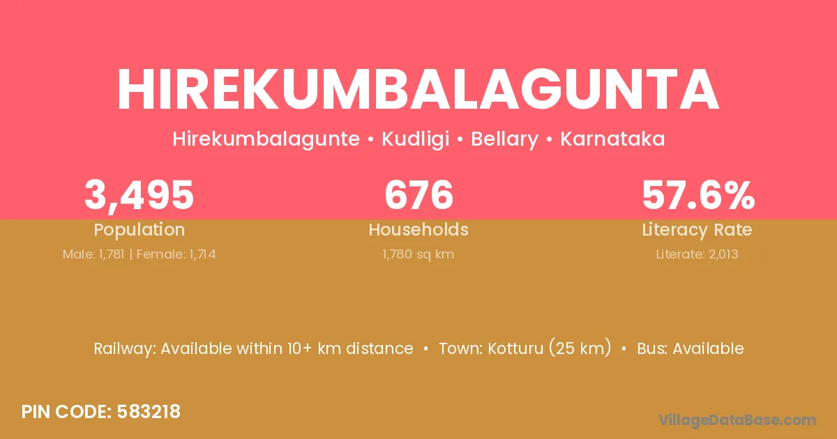 Hirekumbalagunta village has a total population of 3,495 people, of which 1,781 are males and 1,714 are females.