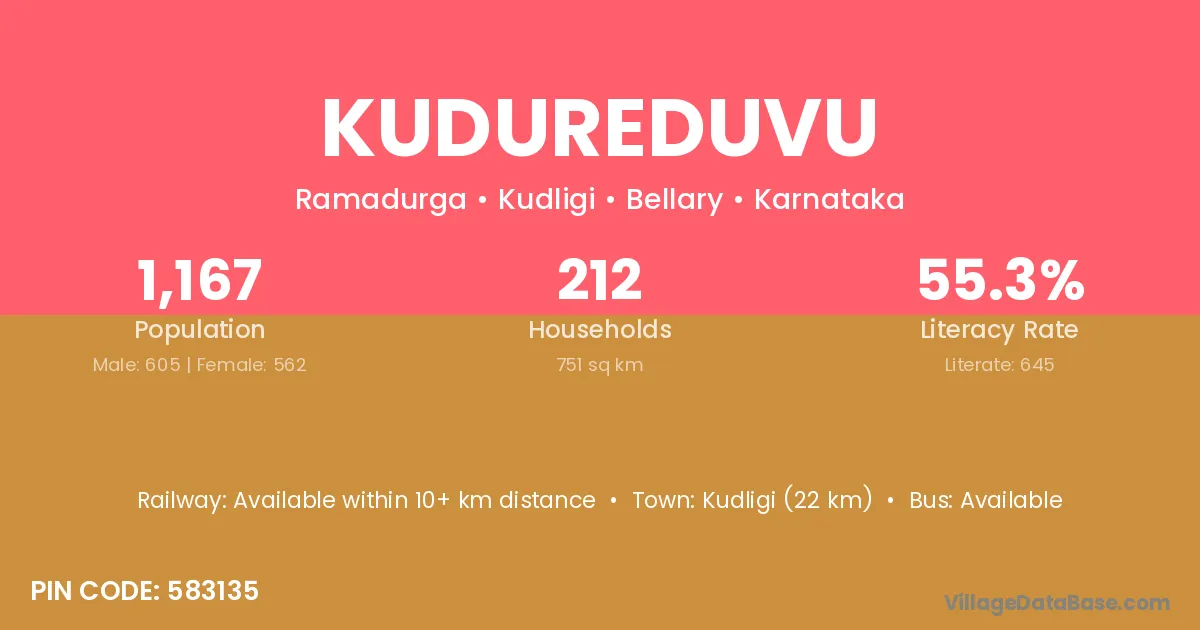 Kudligi (22 km) is the nearest town to Kudureduvu village for major economic activities and is located approximately 22 km away.