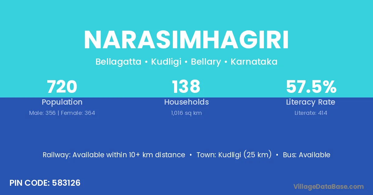Kudligi (25 km) is the nearest town to Narasimhagiri village for major economic activities and is located approximately 25 km away.