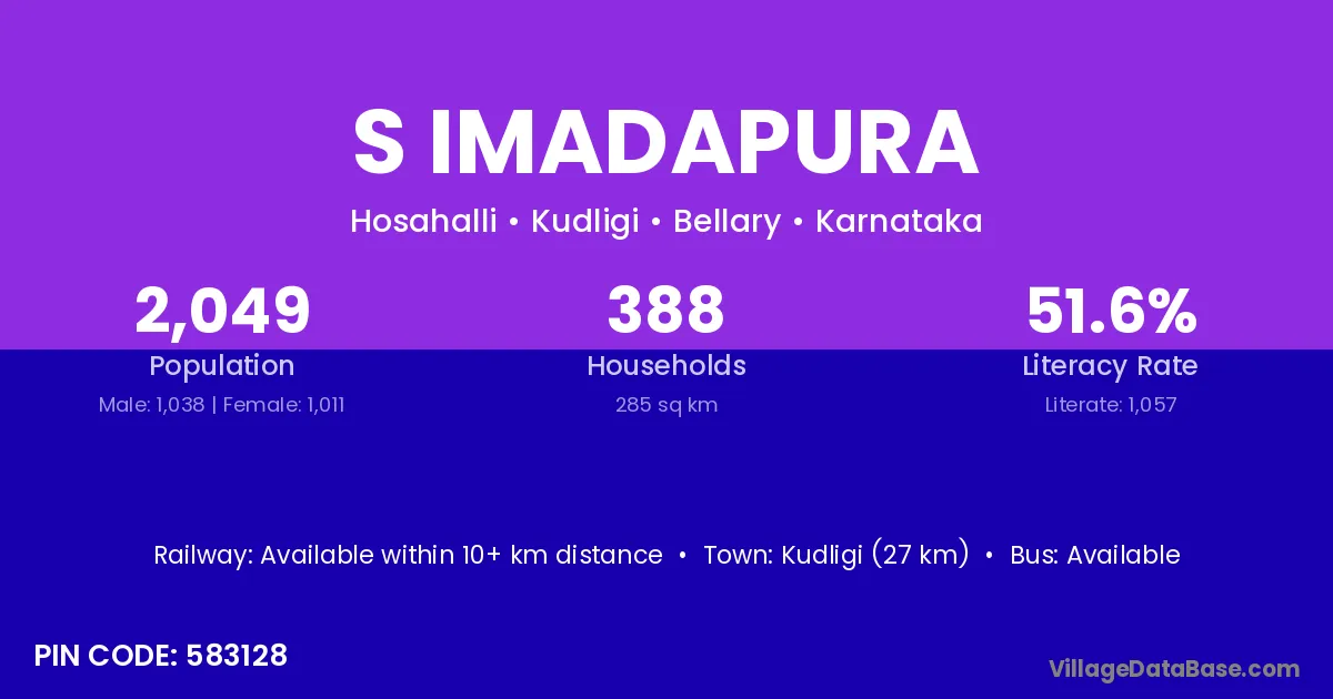 Kudligi (27 km) is the nearest town to S Imadapura village for major economic activities and is located approximately 27 km away.