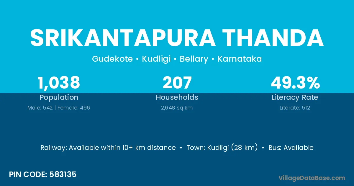 Kudligi (28 km) is the nearest town to Srikantapura Thanda village for major economic activities and is located approximately 28 km away.