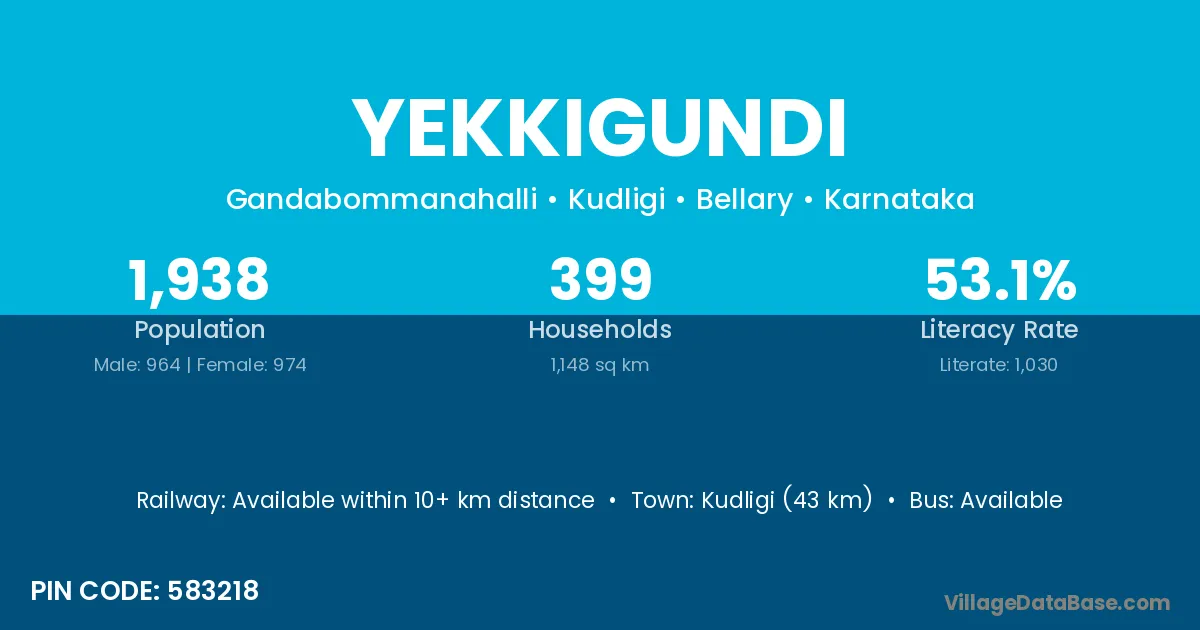 Yekkigundi village has a total population of 1,938 people, of which 964 are males and 974 are females.