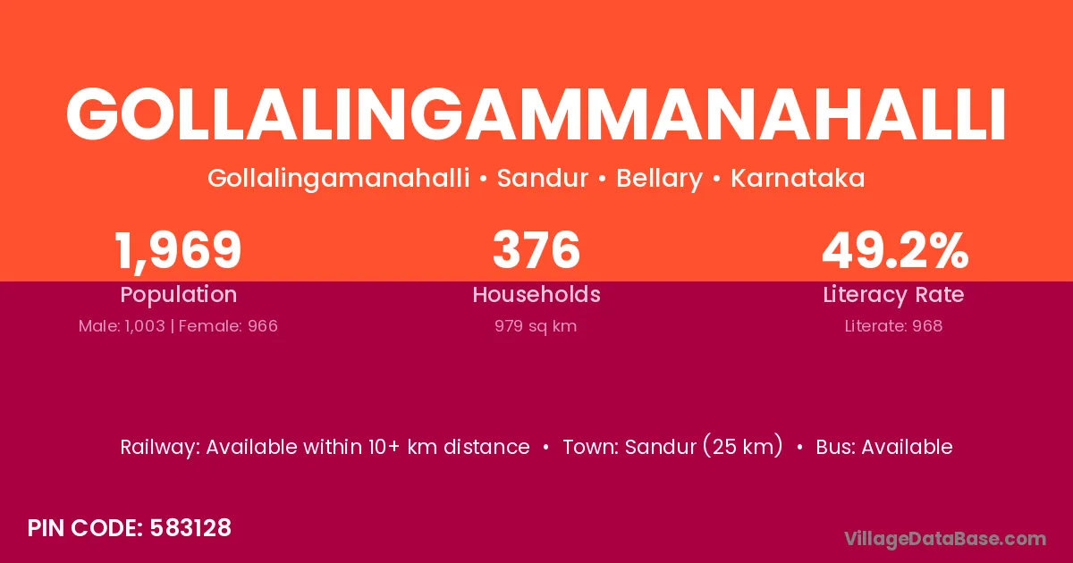 Gollalingammanahalli village has a total population of 1,969 people, of which 1,003 are males and 966 are females.