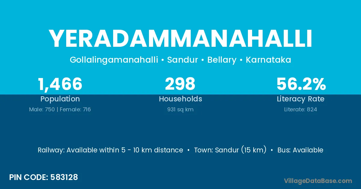 Sandur (15 km) is the nearest town to Yeradammanahalli village for major economic activities and is located approximately 15 km away.