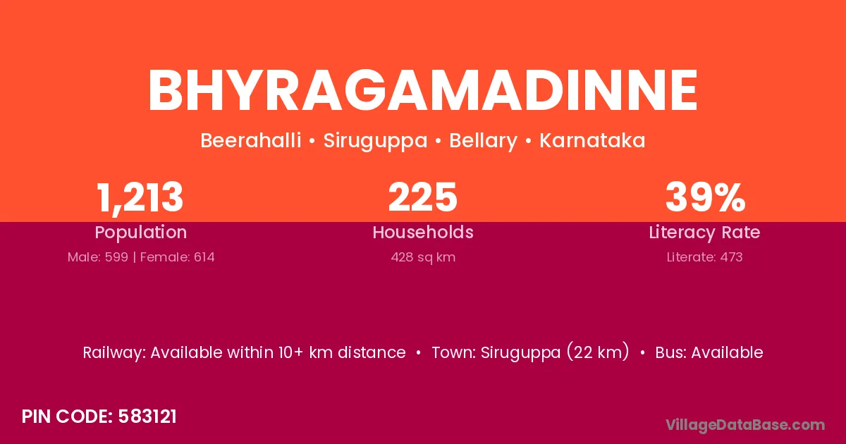 Siruguppa (22 km) is the nearest town to Bhyragamadinne village for major economic activities and is located approximately 22 km away.