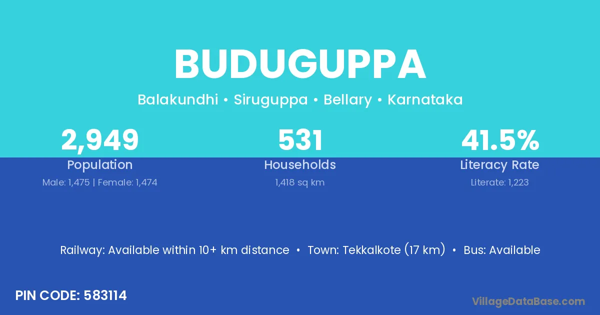 Buduguppa village has a total population of 2,949 people, of which 1,475 are males and 1,474 are females.