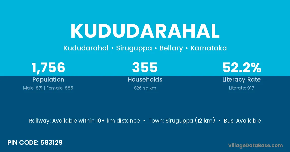 Siruguppa (12 km) is the nearest town to Kududarahal village for major economic activities and is located approximately 12 km away.