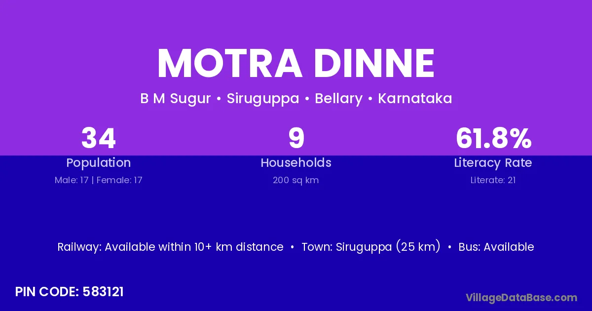 Siruguppa (25 km) is the nearest town to Motra Dinne village for major economic activities and is located approximately 25 km away.
