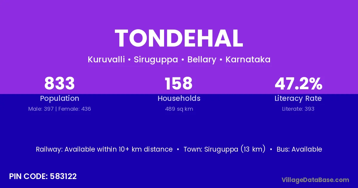 Siruguppa (13 km) is the nearest town to Tondehal village for major economic activities and is located approximately 13 km away.