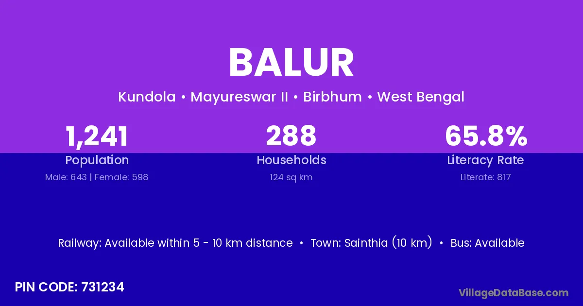 The literacy rate of Balur village is 65.10%. Male literacy stands at 70.73% and female literacy at 59.07%.