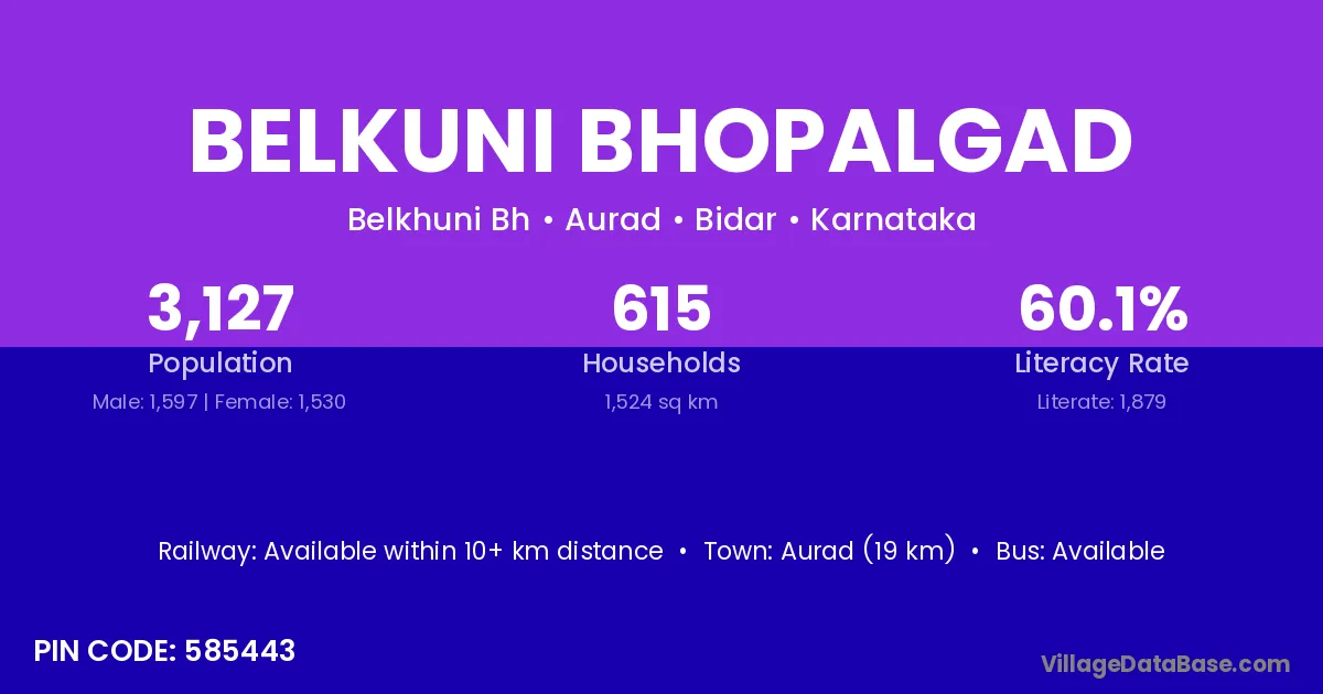 Aurad (19 km) is the nearest town to Belkuni Bhopalgad village for major economic activities and is located approximately 19 km away.