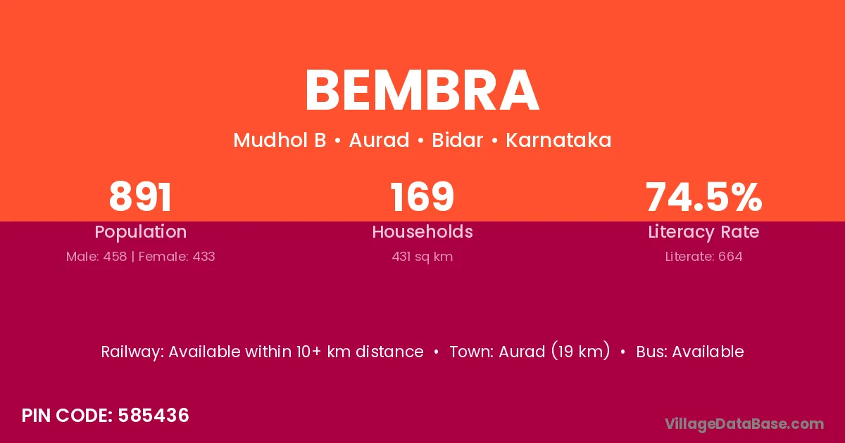 Aurad (19 km) is the nearest town to Bembra village for major economic activities and is located approximately 19 km away.