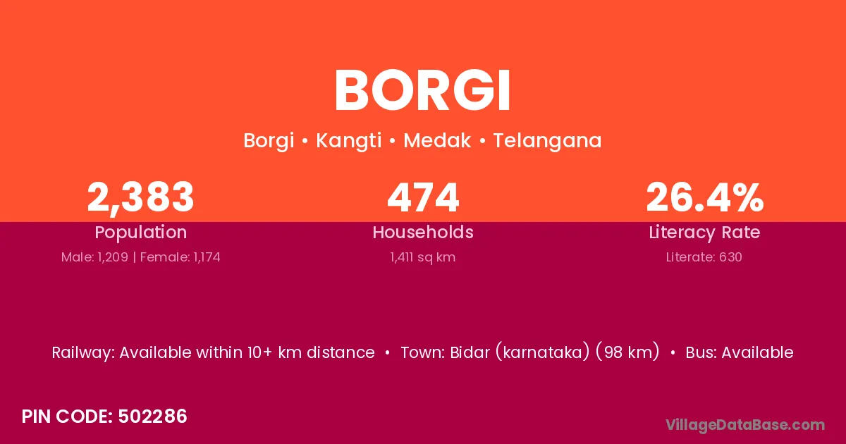 Aurad (19 km) is the nearest town to Borgi village for major economic activities and is located approximately 19 km away.