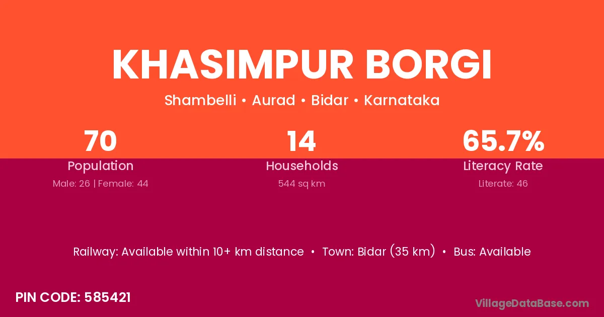 Bidar (35 km) is the nearest town to Khasimpur Borgi village for major economic activities and is located approximately 35 km away.