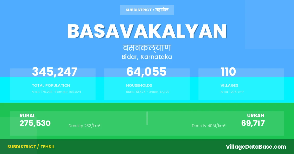 According to the 2011 census The total area of Basavakalyan Taluka is 1206 km², with a population of 345247 people. The population density is 286 inhabitants per square kilometre, and there are approximately 64055 houses in the sub district.