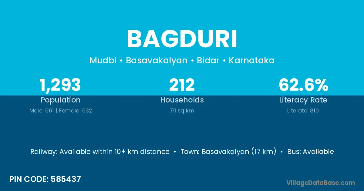 Basavakalyan (17 km) is the nearest town to Bagduri village for major economic activities and is located approximately 17 km away.