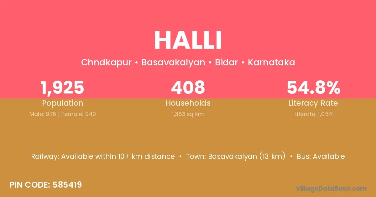 Basavakalyan (13 km) is the nearest town to Halli village for major economic activities and is located approximately 13 km away.
