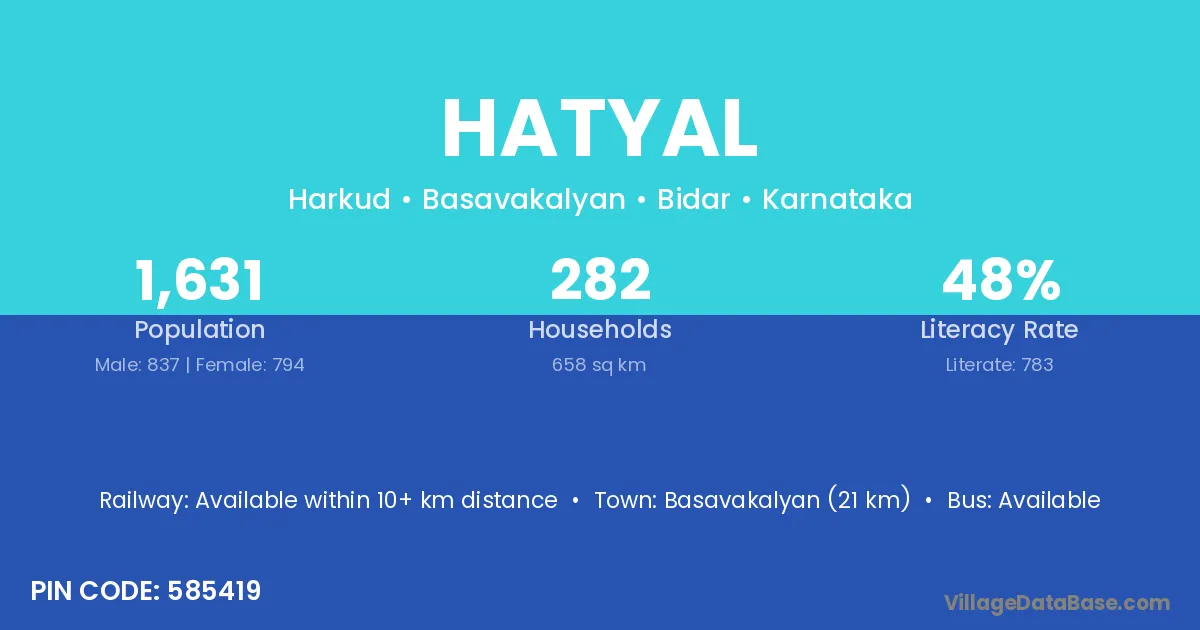 Basavakalyan (21 km) is the nearest town to Hatyal village for major economic activities and is located approximately 21 km away.
