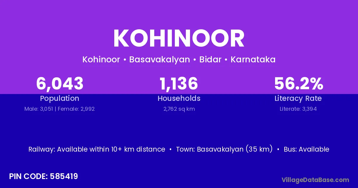 Basavakalyan (35 km) is the nearest town to Kohinoor village for major economic activities and is located approximately 35 km away.