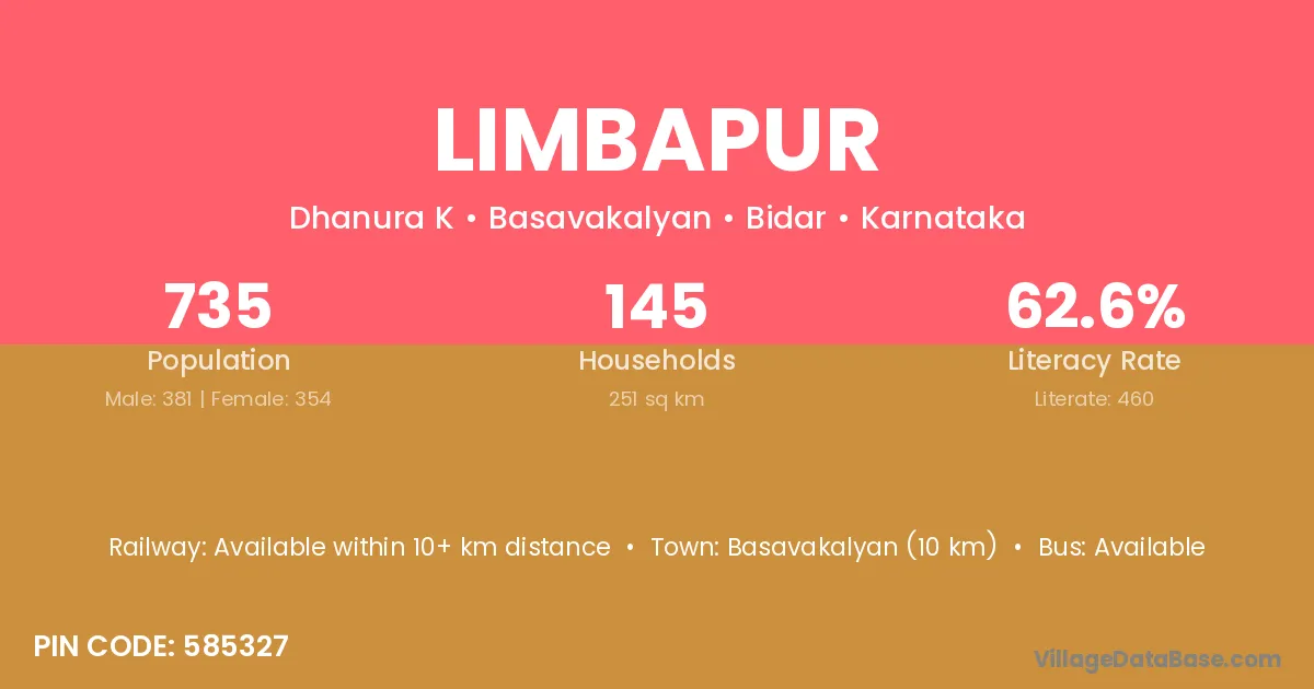 Basavakalyan (10 km) is the nearest town to Limbapur village for major economic activities and is located approximately 10 km away.