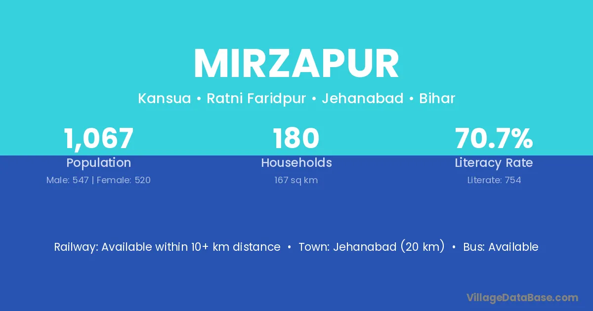 The literacy rate of Mirzapur village is 58.21%. Male literacy stands at 71.09% and female literacy at 45.51%.