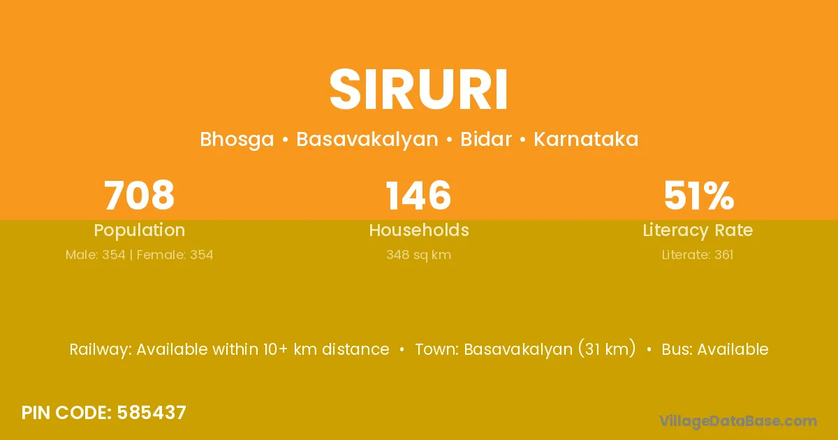 Basavakalyan (31 km) is the nearest town to Siruri village for major economic activities and is located approximately 31 km away.