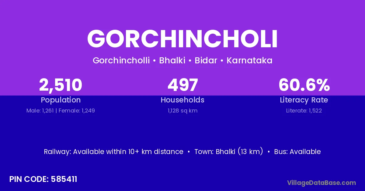 Bhalki (13 km) is the nearest town to Gorchincholi village for major economic activities and is located approximately 13 km away.