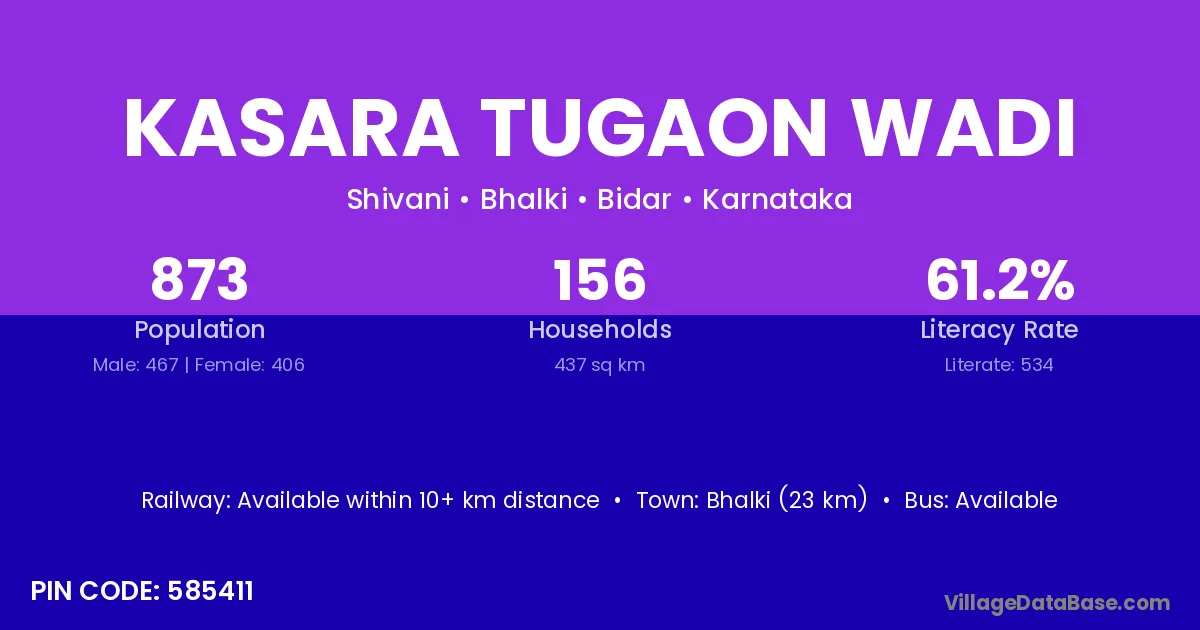 Bhalki (23 km) is the nearest town to Kasara Tugaon Wadi village for major economic activities and is located approximately 23 km away.