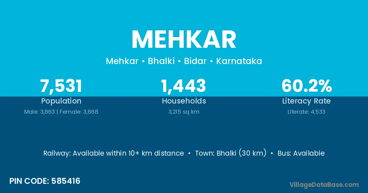 Bhalki (30 km) is the nearest town to Mehkar village for major economic activities and is located approximately 30 km away.