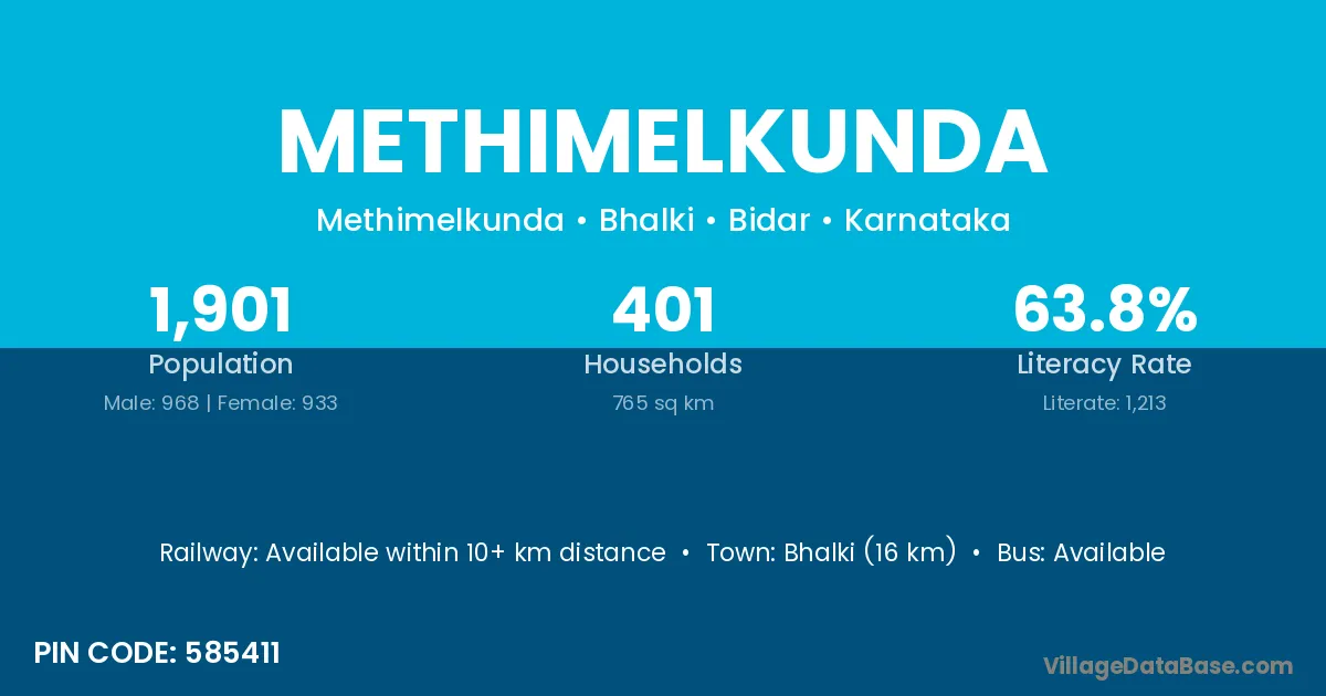 Bhalki (16 km) is the nearest town to Methimelkunda village for major economic activities and is located approximately 16 km away.