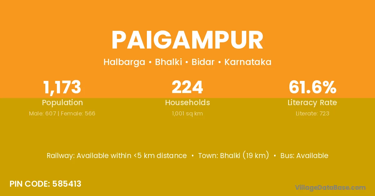 Bhalki (19 km) is the nearest town to Paigampur village for major economic activities and is located approximately 19 km away.