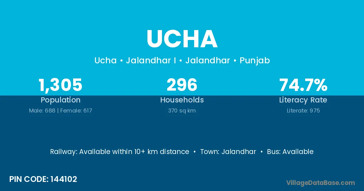 The literacy rate of Ucha village is 62.49%. Male literacy stands at 71.77% and female literacy at 52.42%.